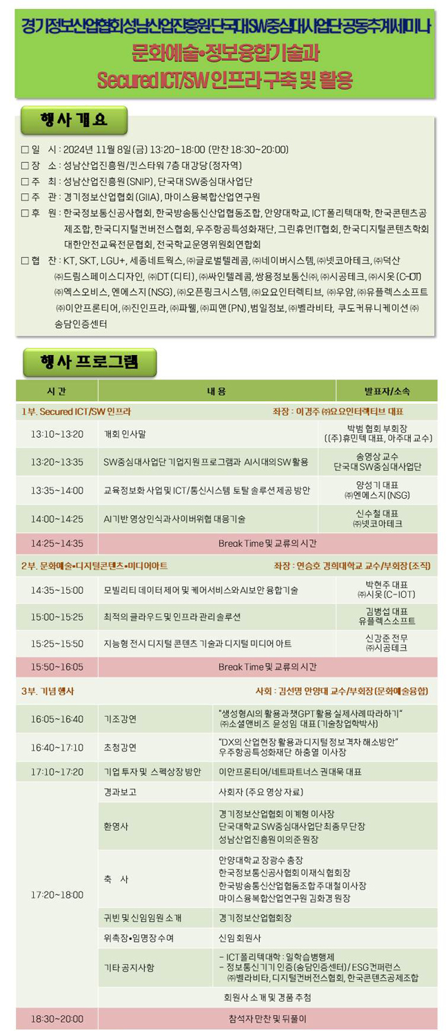 11¿ù 8ÀÏ(±Ý) °æ±âÁ¤º¸»ê¾÷Çùȸ ∙ ¼º³²»ê¾÷ÁøÈï¿ø ∙  ´Ü±¹´ë SWÁ߽ɴë»ç¾÷´ÜÀÇ Ãß°è°øµ¿¼¼¹Ì³ª°¡ ¾Æ·¡¿Í °°ÀÌ °³Ãֵ˴ϴÙ.
